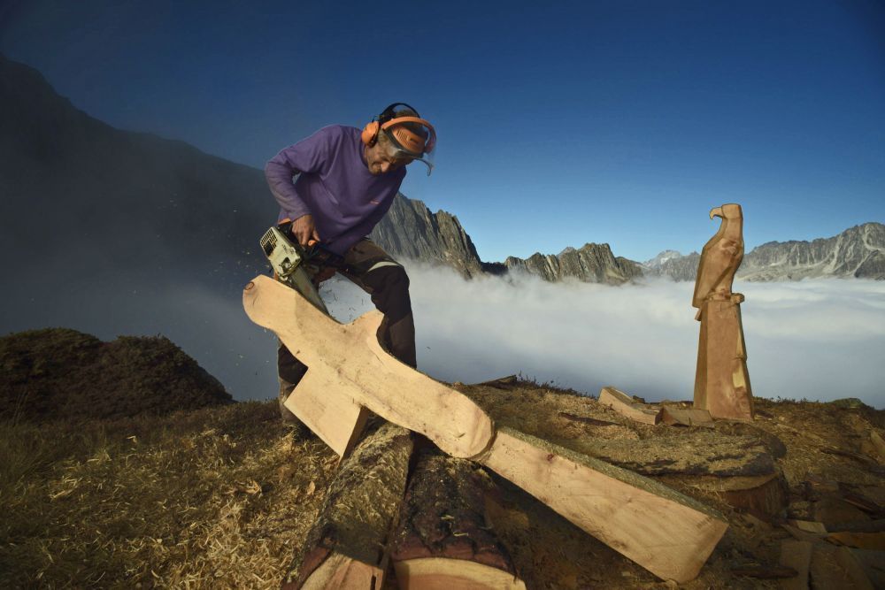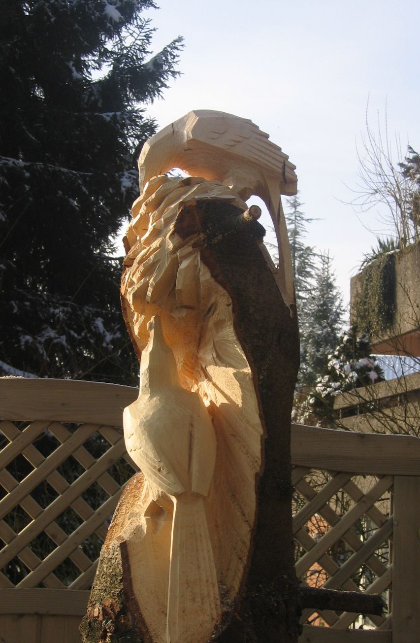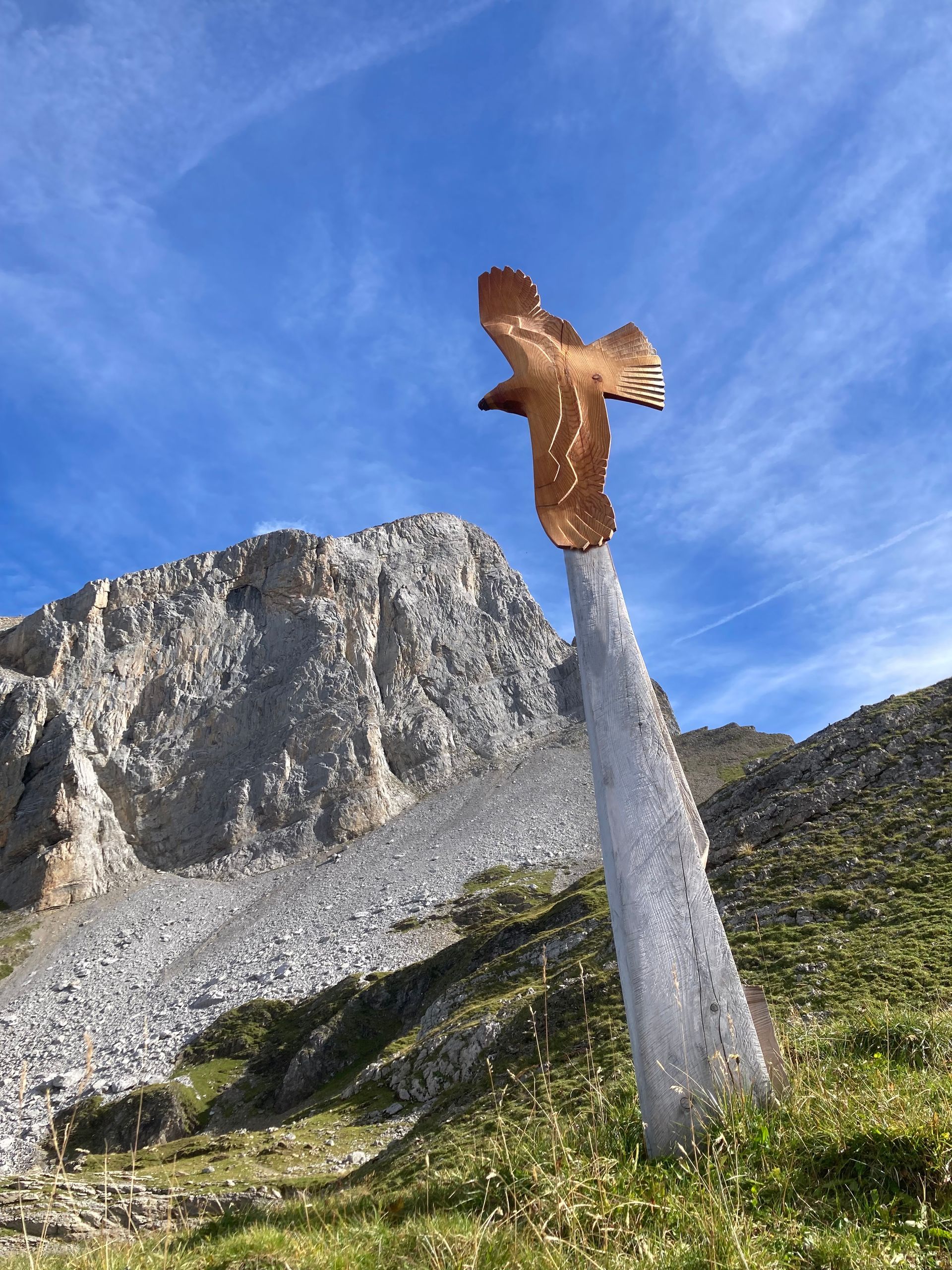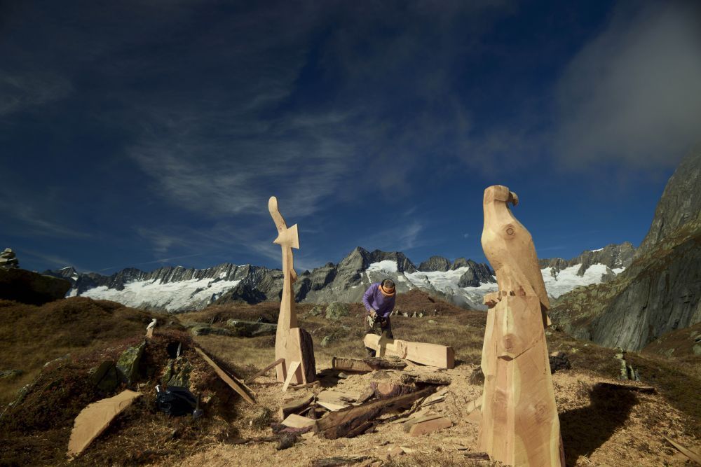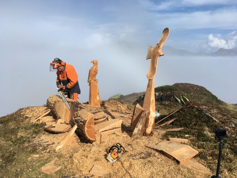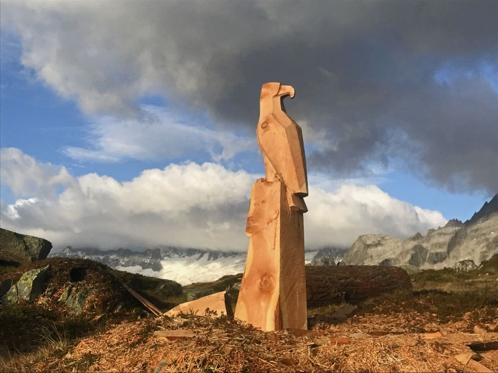 Flying Eagles, Salbit. Im Freiluftatelier auf dem Ober Höhenberg schuf ich im September 2019 mit der Kettensäge und Schnitzmesser aus einem Lärchenstamm aus dem Bergwald unterhalb der Salbithütte einen sitzenden und zwei fliegende Adler. der sitzende Adler ( Blick zurück) begrüss die Wanderer und Kletterer am Weg zur Salbitbrücke. Die fliegenden Adler (Flying Eagle) fliegen etwas unterhalb des Ober Höhenbergs.