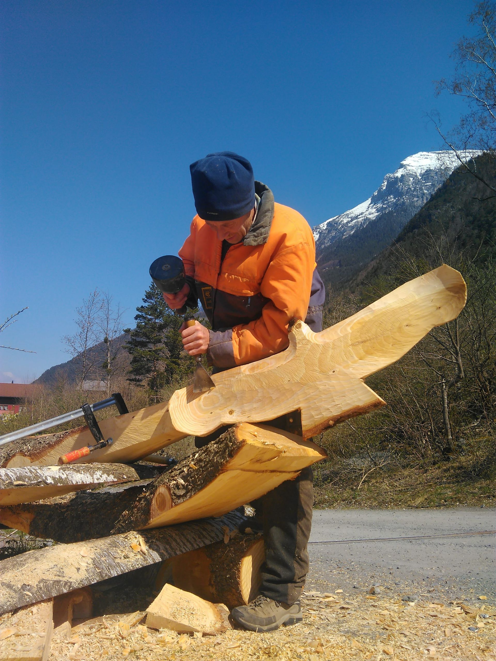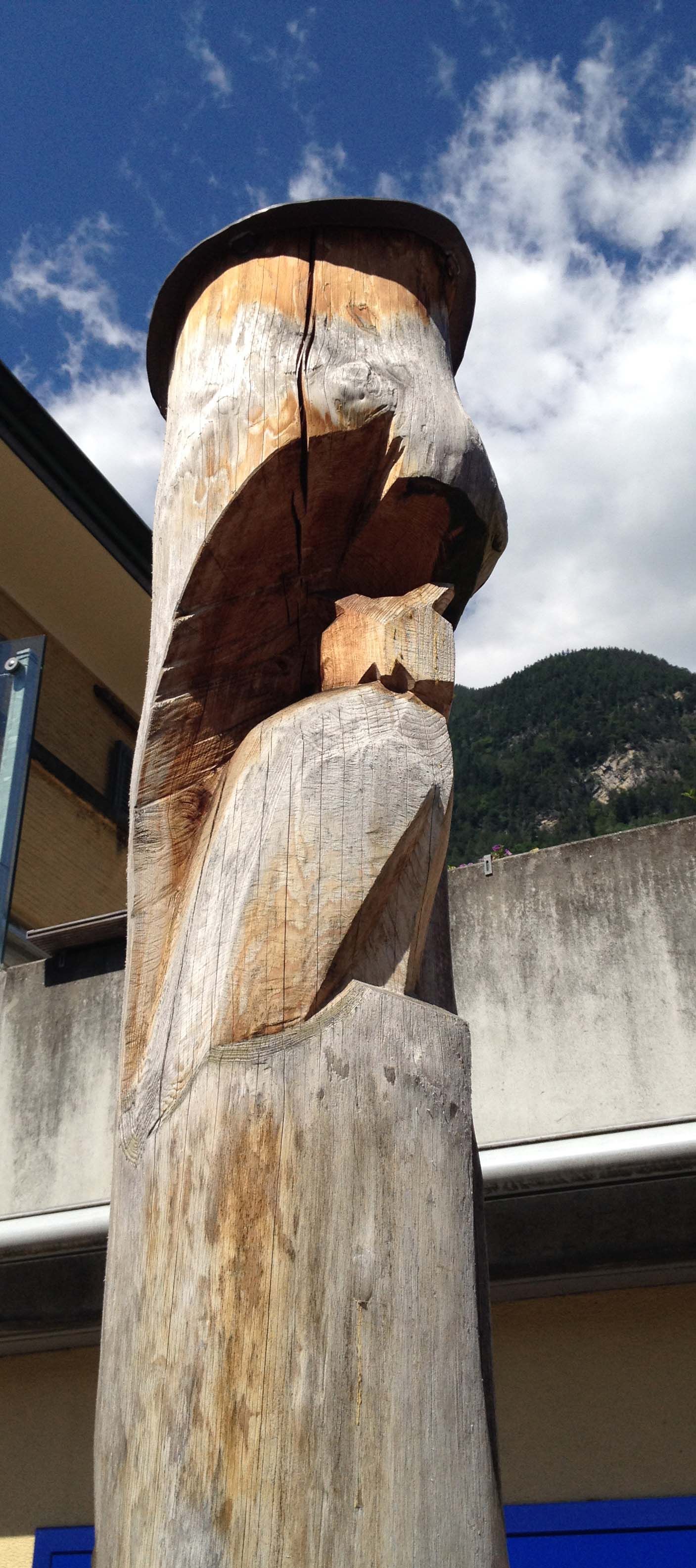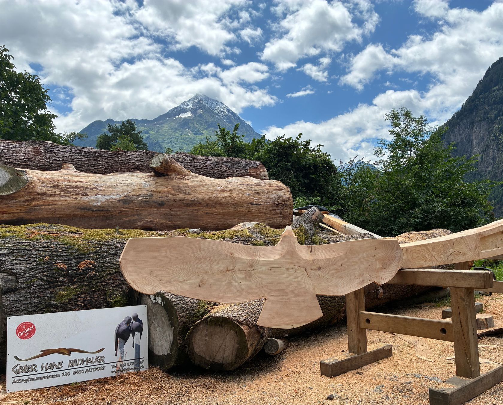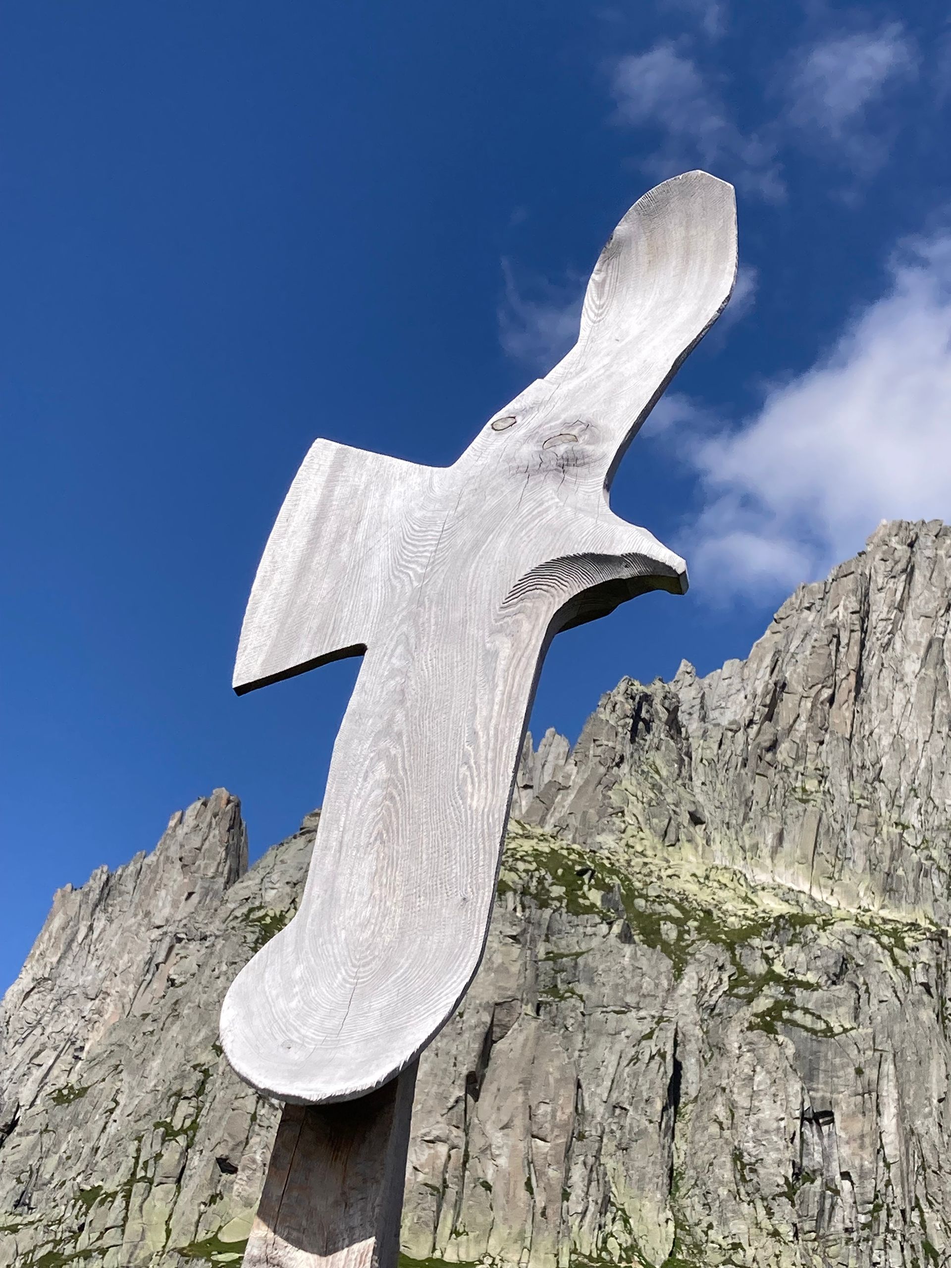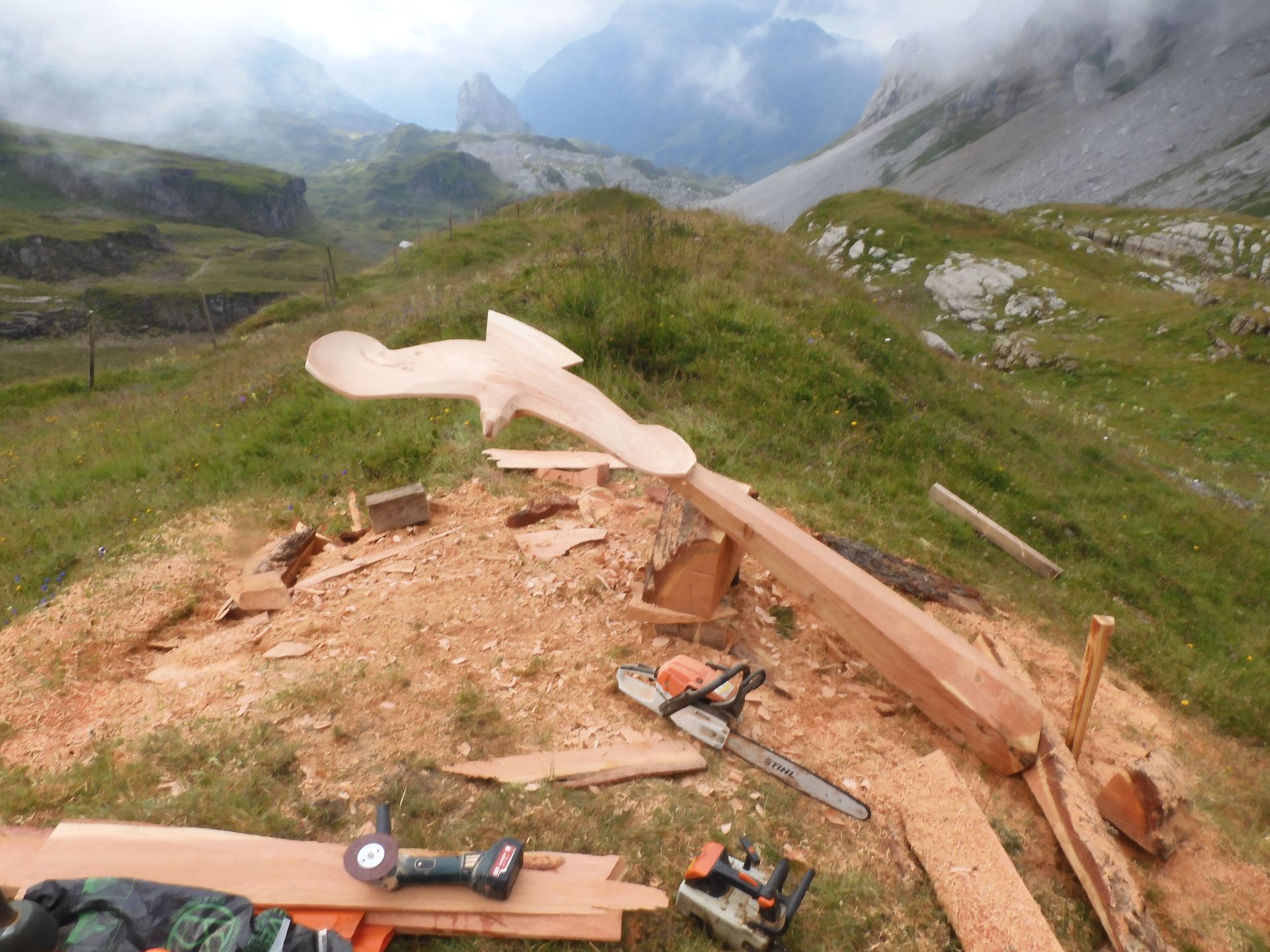 Flying Eagles, Salbit. Im Freiluftatelier auf dem Ober Höhenberg schuf ich im September 2019 mit der Kettensäge und Schnitzmesser aus einem Lärchenstamm aus dem Bergwald unterhalb der Salbithütte einen sitzenden und zwei fliegende Adler. der sitzende Adler ( Blick zurück) begrüss die Wanderer und Kletterer am Weg zur Salbitbrücke. Die fliegenden Adler (Flying Eagle) fliegen etwas unterhalb des Ober Höhenbergs.