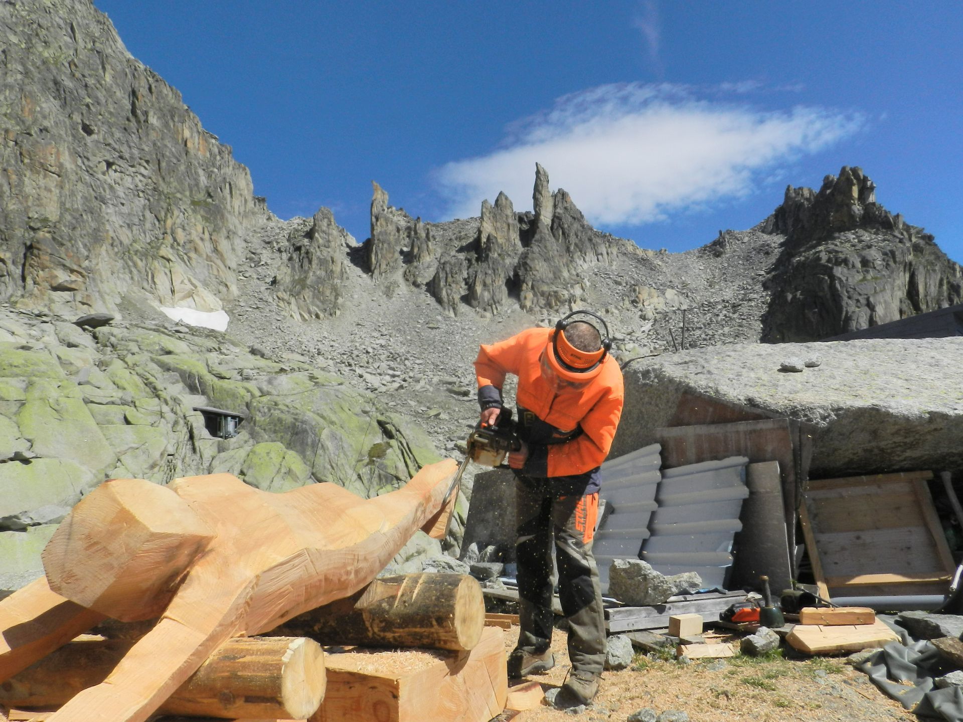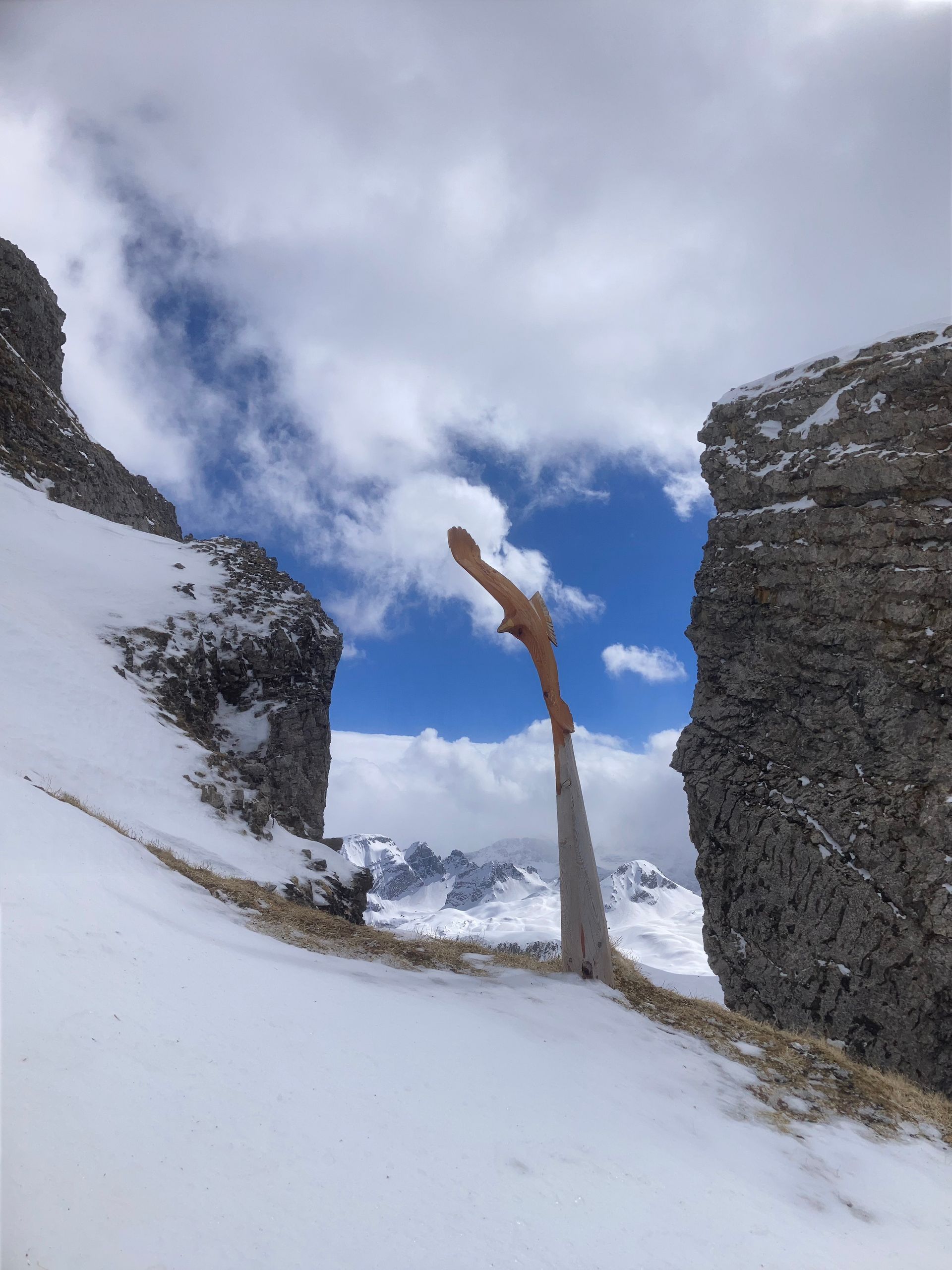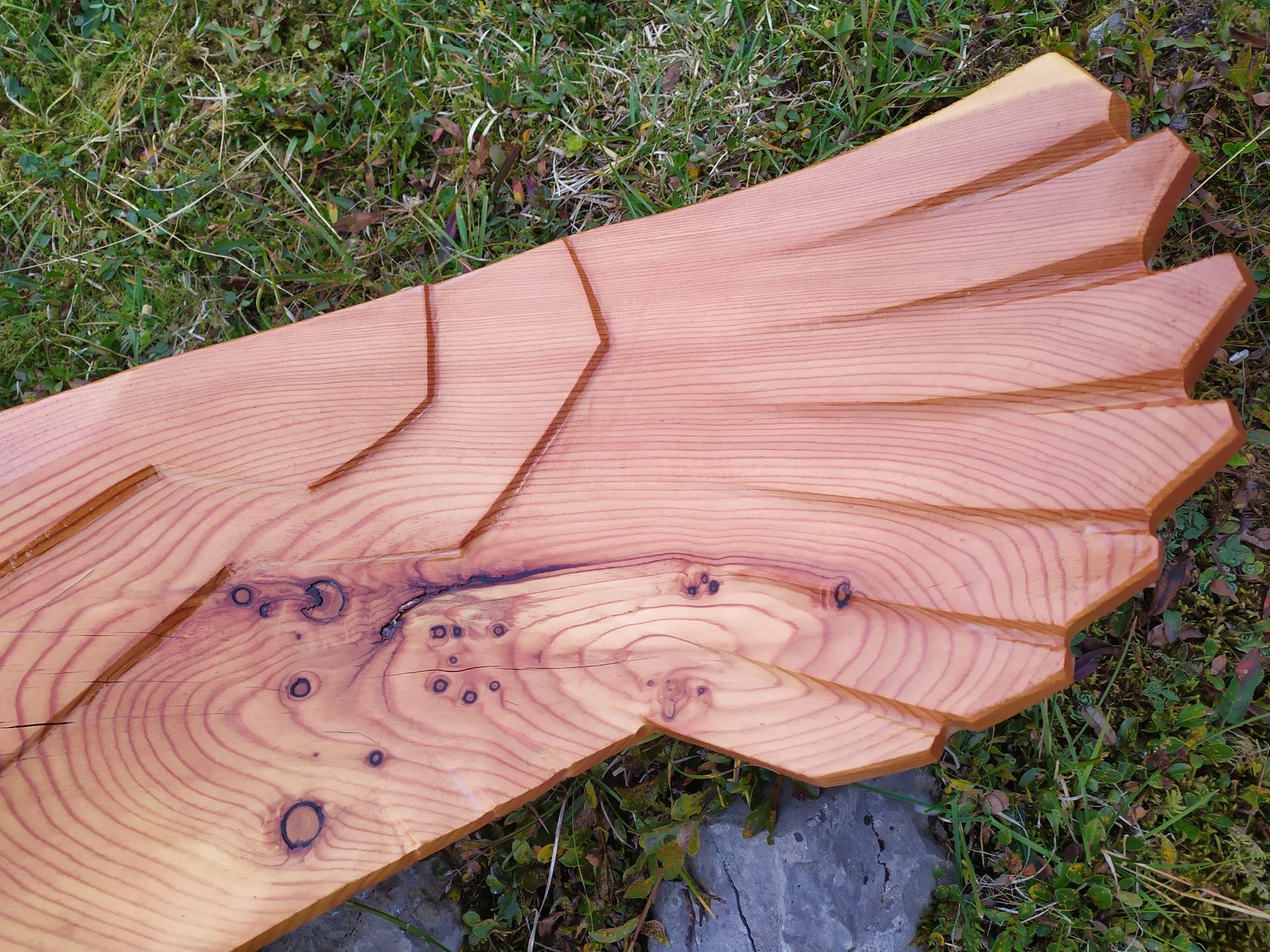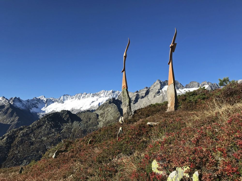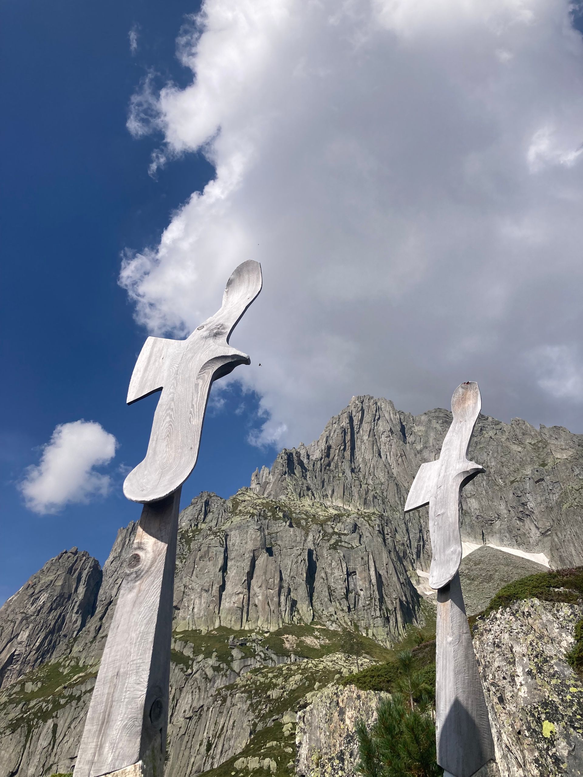 Flying Eagles, Salbit. Im Freiluftatelier auf dem Ober Höhenberg schuf ich im September 2019 mit der Kettensäge und Schnitzmesser aus einem Lärchenstamm aus dem Bergwald unterhalb der Salbithütte einen sitzenden und zwei fliegende Adler. der sitzende Adler ( Blick zurück) begrüss die Wanderer und Kletterer am Weg zur Salbitbrücke. Die fliegenden Adler (Flying Eagle) fliegen etwas unterhalb des Ober Höhenbergs.