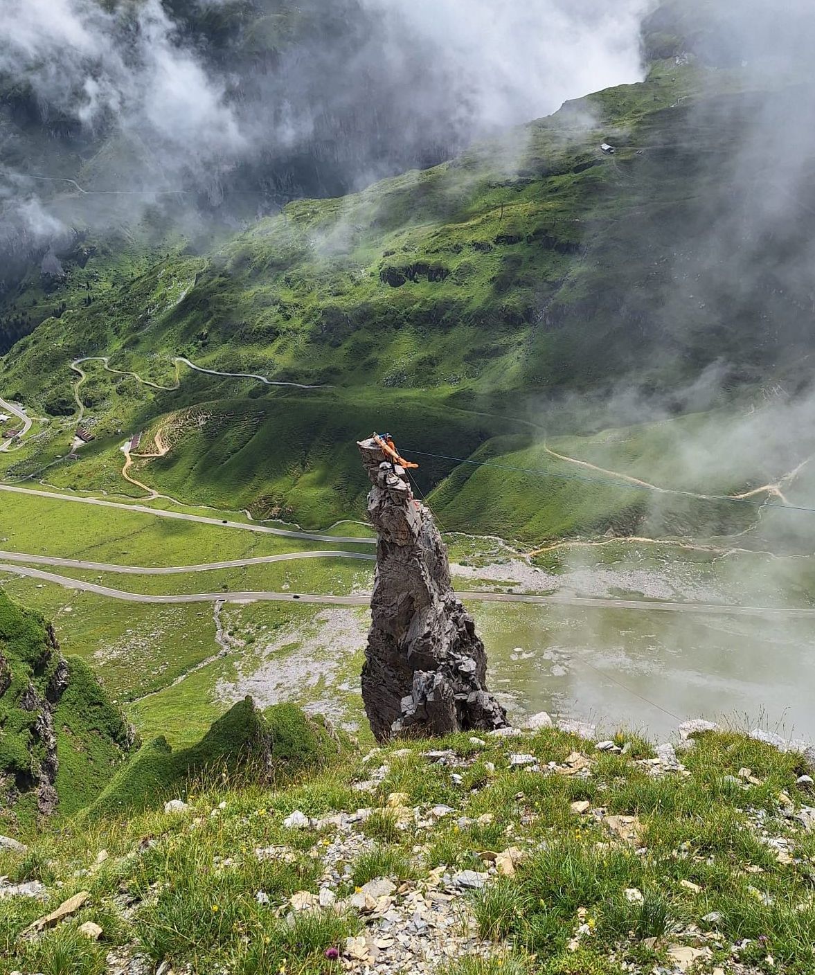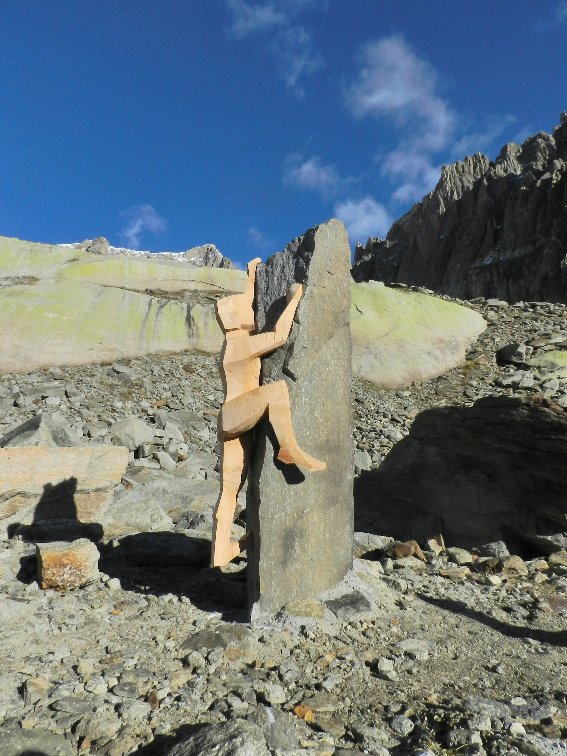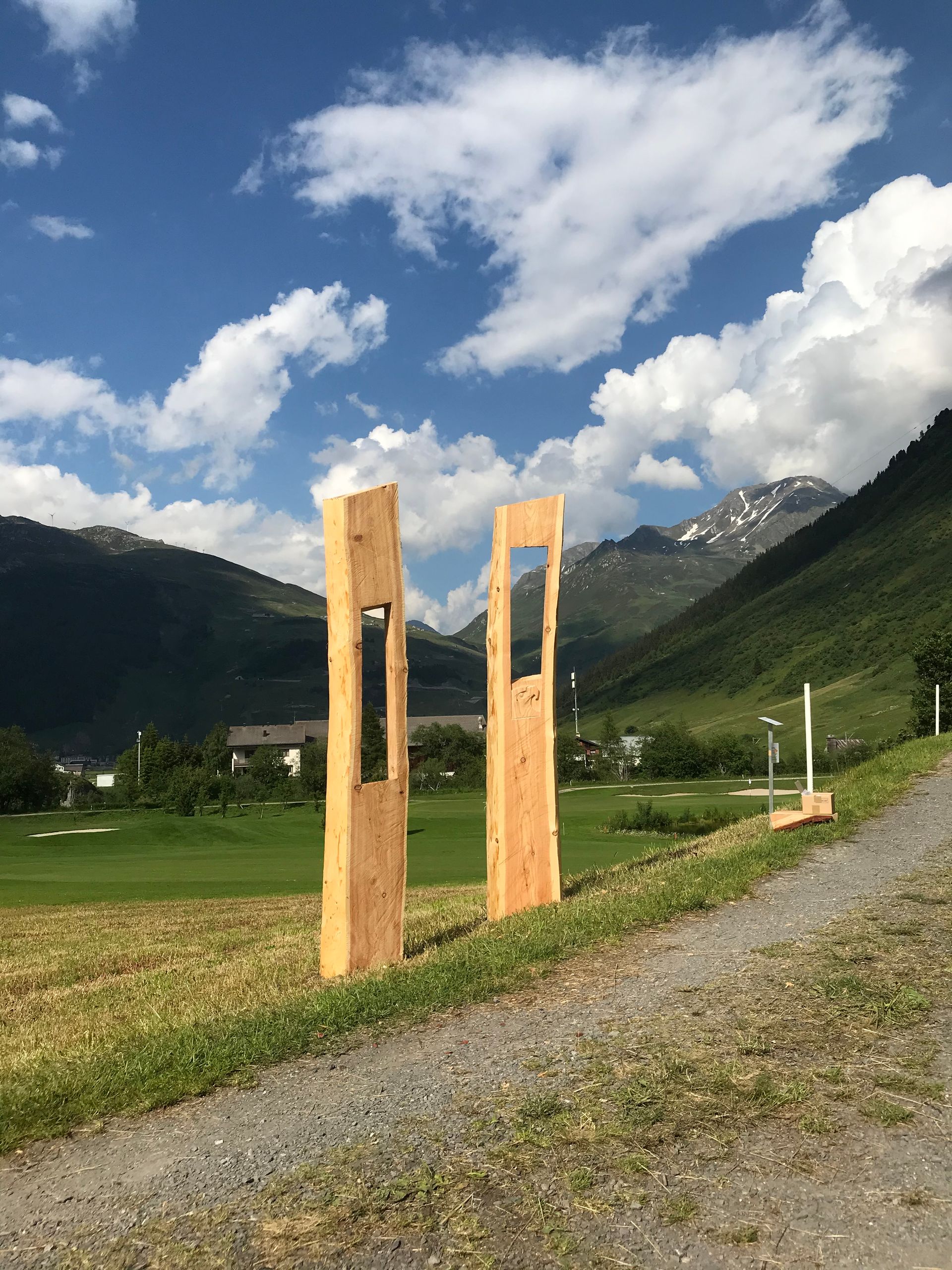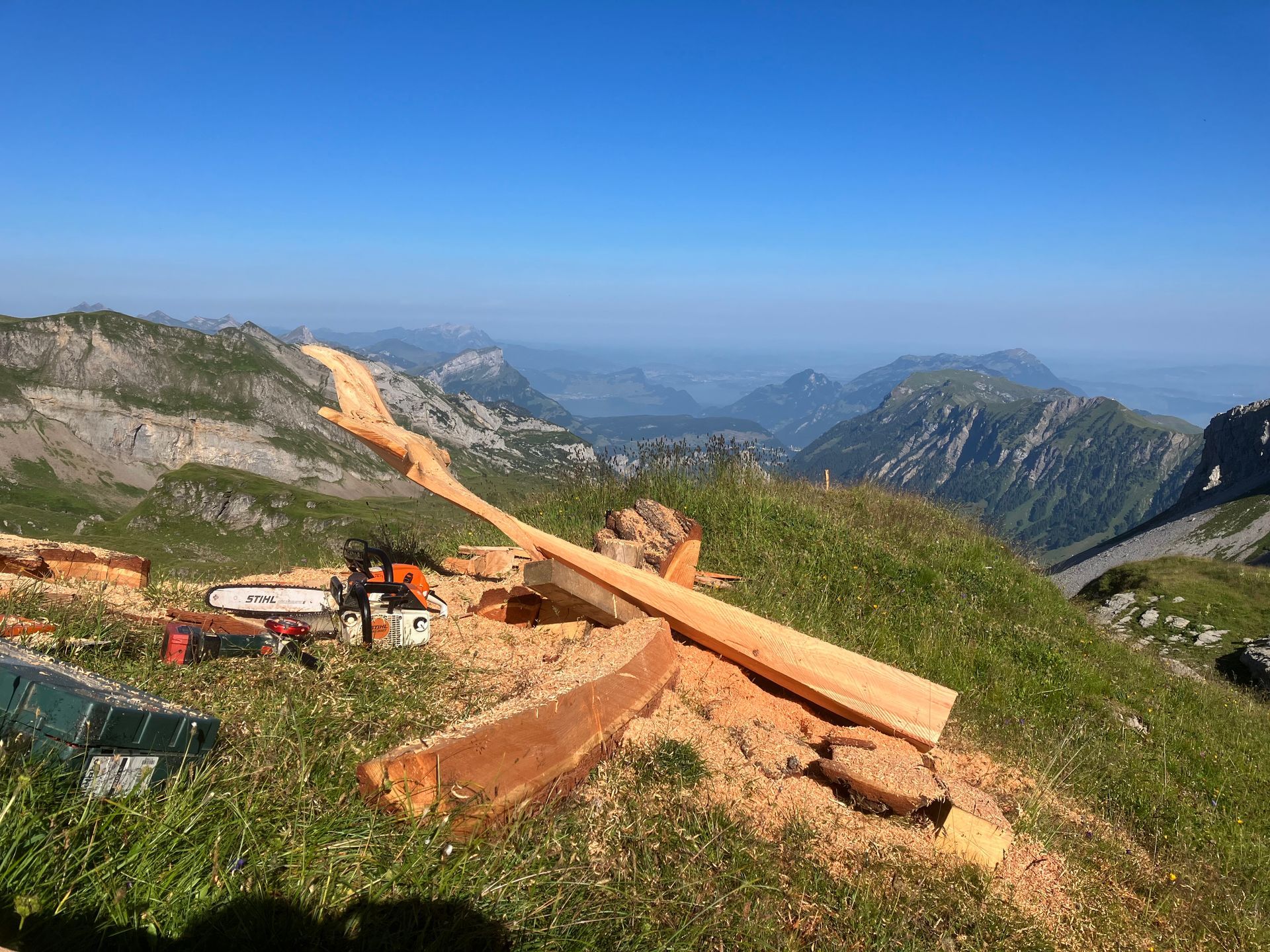 Flying Eagles, Salbit. Im Freiluftatelier auf dem Ober Höhenberg schuf ich im September 2019 mit der Kettensäge und Schnitzmesser aus einem Lärchenstamm aus dem Bergwald unterhalb der Salbithütte einen sitzenden und zwei fliegende Adler. der sitzende Adler ( Blick zurück) begrüss die Wanderer und Kletterer am Weg zur Salbitbrücke. Die fliegenden Adler (Flying Eagle) fliegen etwas unterhalb des Ober Höhenbergs.