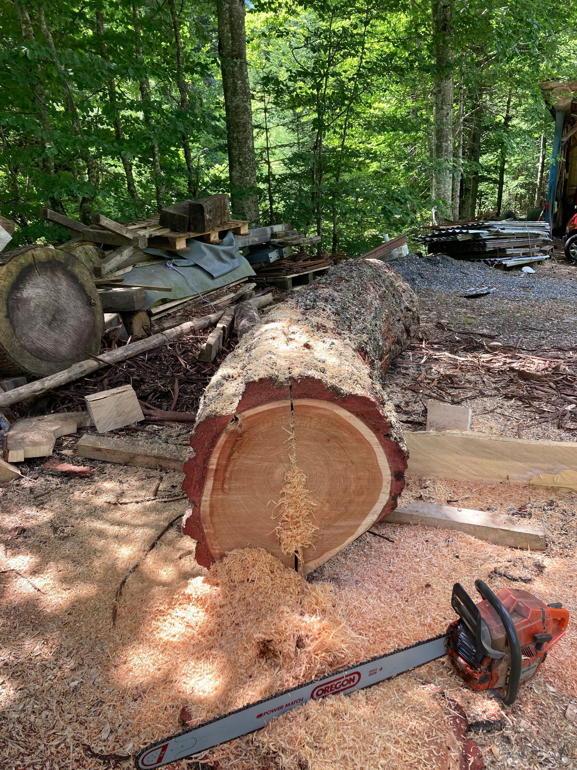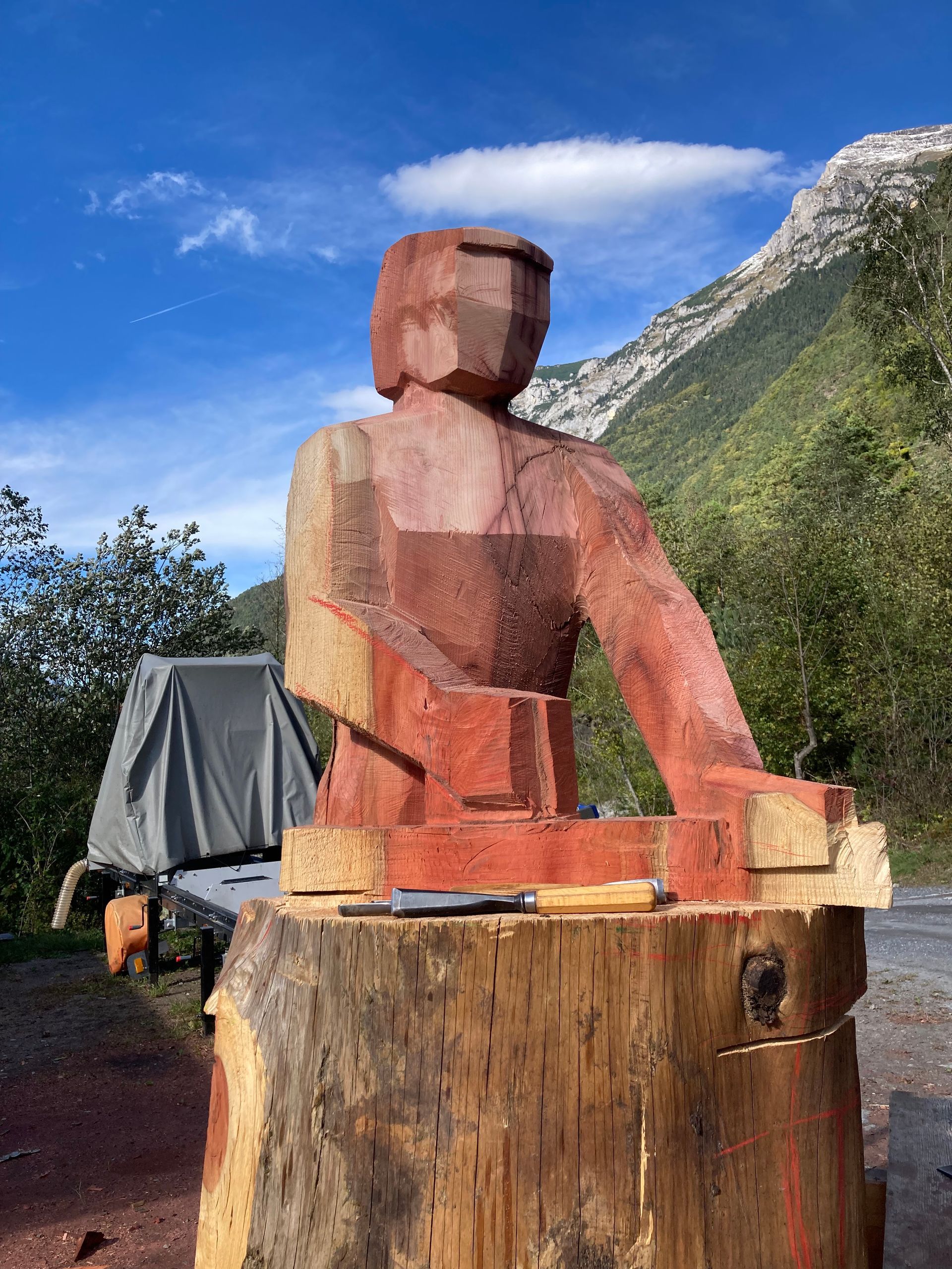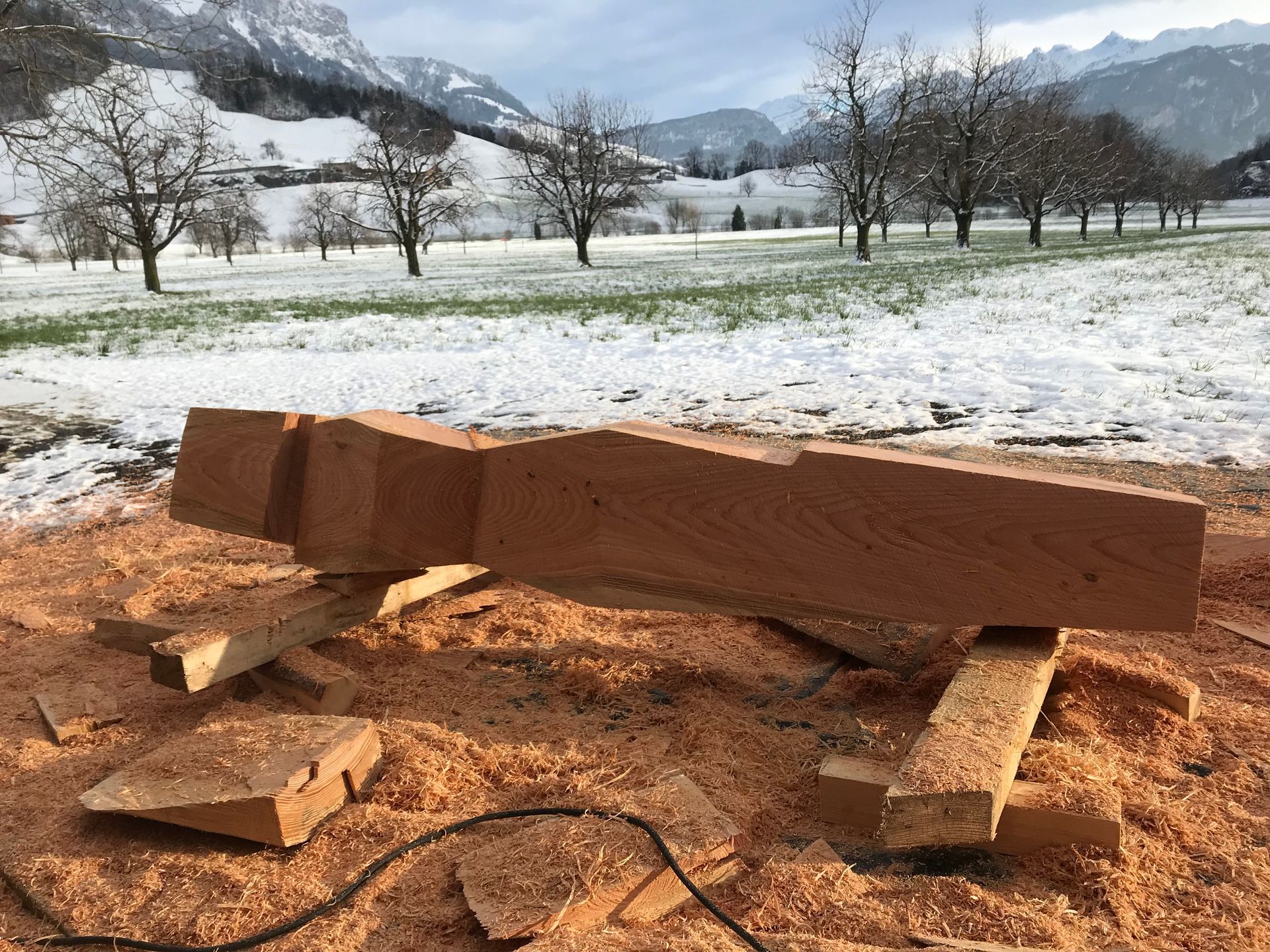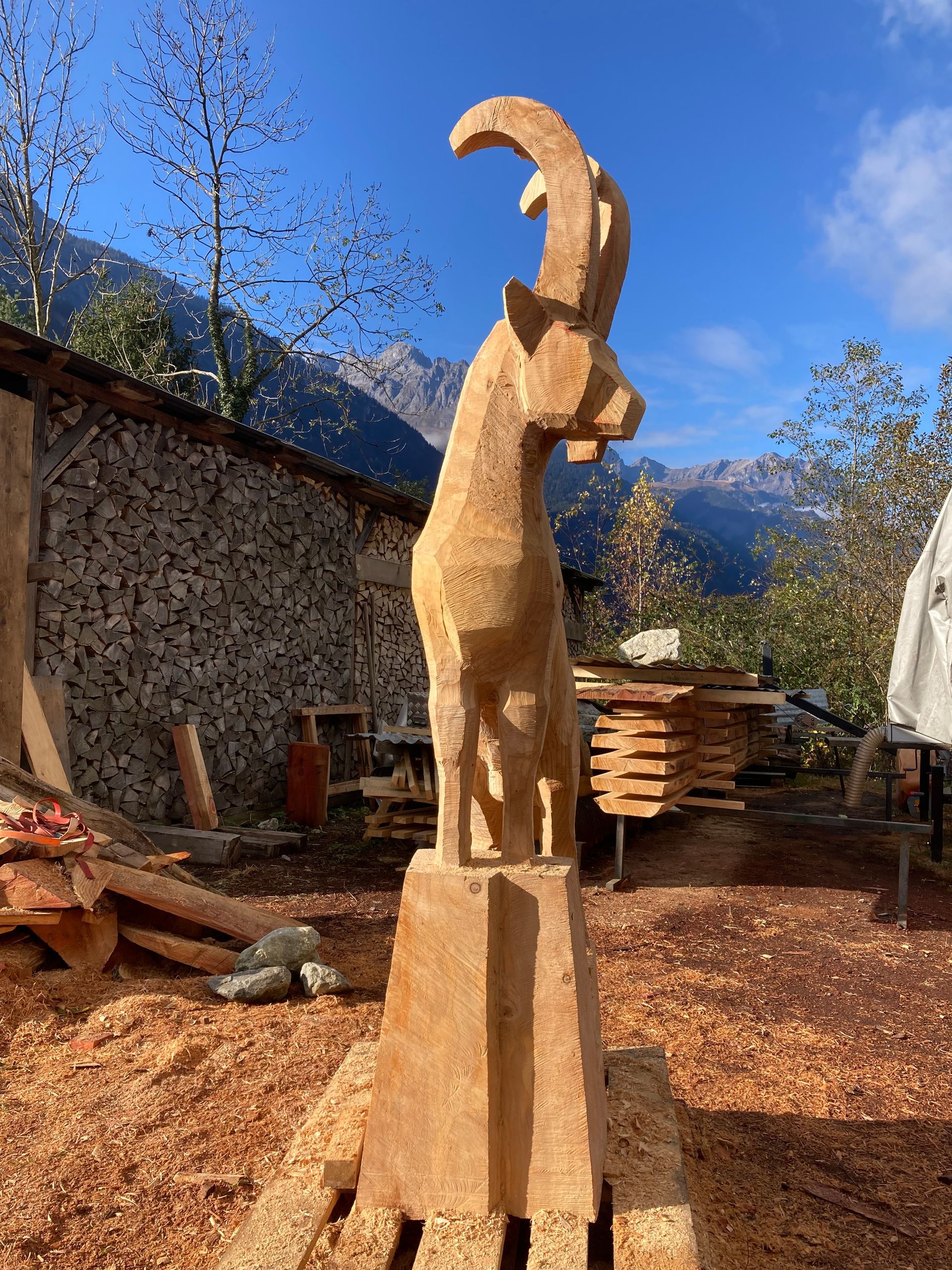 Für meine Kunst verwende ich sorgfältig ausgewählte Baumstämme und Äste aus der Region. Ich arbeite mit Apfelbaum, Kastanie, Lärche, Kirsche und – wenn verfügbar – auch mit Mondholz. Die nachhaltige Nutzung regionaler Ressourcen ist für mich ein wichtiger Bestandteil meiner Arbeit.